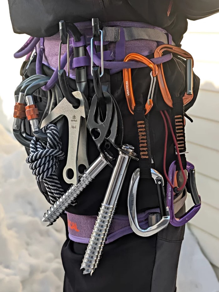 Карабин устанавливается на пояс беседки или привязи в специальный слот, помогает разместить и упорядочить снаряжение или инструменты при переноске.